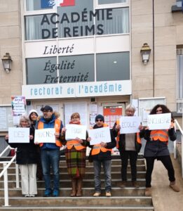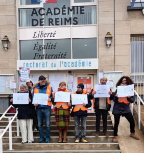 Nous nous sommes donc rassemblés le vendredi devant le rectorat de Reims créant ainsi l’évènement : affichages de toutes les expressions sur la façade, discussions avec les passants, présentation des revendications à la presse…