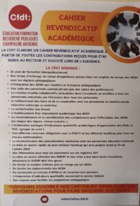 Lors de la semaine de l'inclusion du 17 au 21 novembre la CFDT Éducation Formation Recherche Publiques est allée à la rencontre de tous les personnels acteurs de l'école inclusive. Ce fût l'occasion de recueillir des témoignages et de présenter un cahier revendicatif en audience au rectorat.